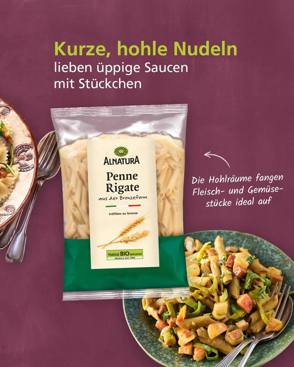 Die Entscheidung für Nudeln in Bio-Qualität bietet eine ganze Reihe an Vorteilen. Alnatura legt besonderen Wert darauf, dass nur die Zutaten verwendet werden, die für ein schmackhaftes Produkt wirklich nötig sind. Bio-Nudeln werden aus Zutaten hergestellt, die ohne den Einsatz von synthetischen Pestiziden, Herbiziden oder chemischen Düngemitteln angebaut werden. Zudem unterstützen Sie mir Ihrer Entscheidung für Bio-Nudeln den biologischen Landbau, der sich positiv auf Tierschutz, Böden und Artenvielfalt auswirkt und die Umweltbelastungen verringert.