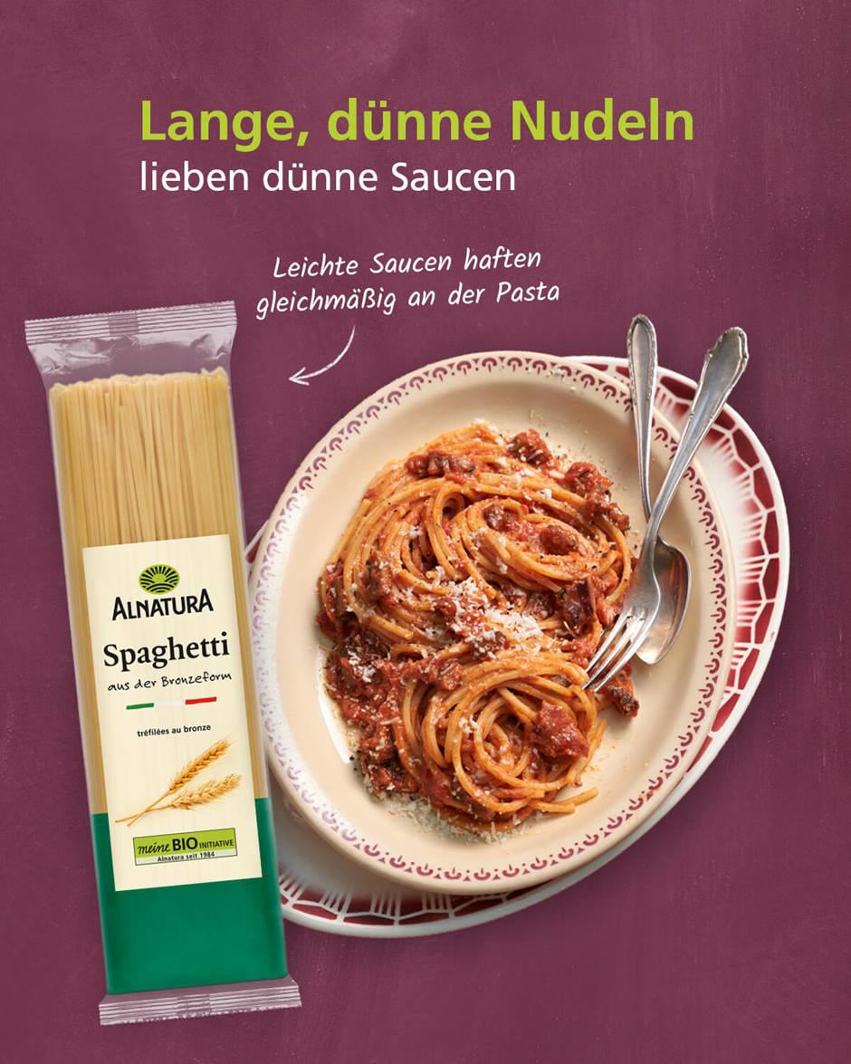 - Nudel und Soße optimal kombiniert: Je dicker, stückiger und würziger die Soße ist, desto dicker und breiter sollten die Nudeln sein. Umgekehrt passen lange dünne Nudeln am besten zu leichten, eher flüssigen Soßen. Übrigens: Je rauer die Nudeloberfläche ist, desto besser haftet die Soße.