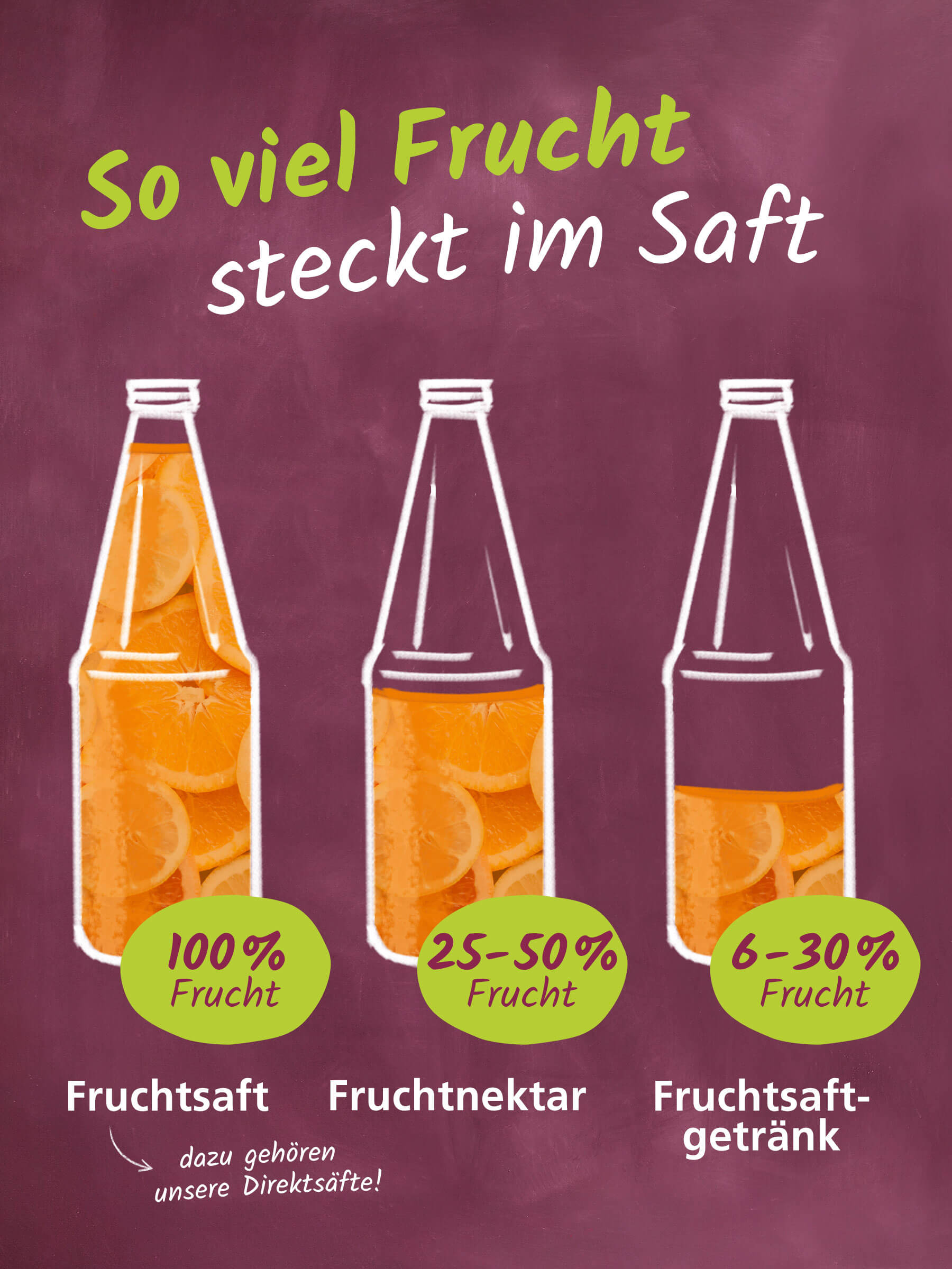 Ob die Bezeichnung Fruchtsaft, Fruchtsaftgetränk oder Fruchtnektar die richtige ist, regelt eine Verordnung. Denn nicht immer steckt ausschließlich Saft in der Flasche, auch Wasser, Süßungsmittel und sogar Aromen können hinzukommen. Um welche Saftart es sich handelt, ist auf dem Etikett nachzulesen: Nur bei 100 Prozent Fruchtgehalt darf das Getränk Fruchtsaft genannt werden. Früchte mit einem hohen Säuregehalt (zum Beispiel Quitte, Johannisbeere) oder viel Fruchtfleisch (Banane, Mango) werden häufig als Fruchtnektar angeboten, ihr Fruchtgehalt liegt zwischen 25 und 50 Prozent. Ein Fruchtsaftgetränk hingegen enthält lediglich 6 bis 30 Prozent Frucht, der Rest sind Wasser, Zucker, Honig oder Ähnliches.