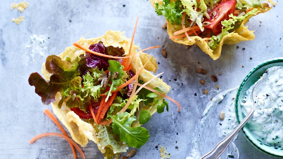 Blattsalat im Parmesankörbchen mit Kräuterquark