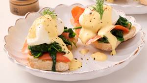 Ciabattine quer durchschneiden und die Hälften noch einmal kurz toasten. Auf 4 Teller geben, Lachs und Spinat gleichmäßig auf den Hälften verteilen. Je 1 pochiertes Ei daraufgeben und mit Sauce Hollandaise garnieren.