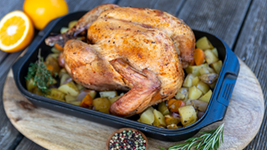 Backofen auf 160 °C Umluft vorheizen. Innereien und Hals aus der Bauchhöhle der Pute herausnehmen. Kartoffeln und Zwiebel schälen, Karotten und Apfel waschen und alles in 2 cm große Stücke schneiden. Orange schälen und vierteln, Knoblauch schälen, Thymian und Rosmarin waschen.