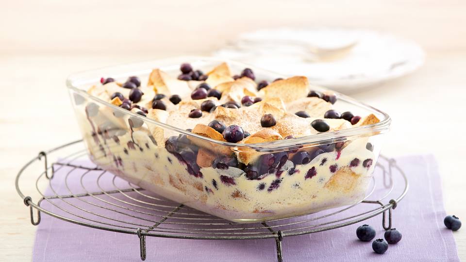 Statt frischer Heidelbeeren kann man auch TK-Heidelbeeren verwenden. Sie kommen noch tiefgefroren in das Gratin. Die Backzeit in dem Fall um wenige Minuten verlängern.