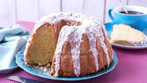 Den Kuchen nach Belieben mit Puderzucker bestäubt servieren. Oder mit einer Glasur aus 40 g Puderzucker und 10 ml Zitronensaft überziehen und mit Kokosraspeln bestreuen.