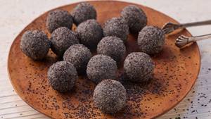 Zu 20 gleich großen Kugeln formen. Den restlichen Mohn in eine Schüssel geben und die Kugeln darin wälzen.