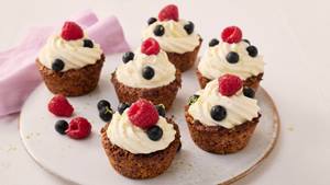 Je 2 TL Fruchtaufstrich in die Cups geben. Joghurtmousse mit einem Löffel oder einem Spritzbeutel gleichmäßig auf den Cups verteilen. Beeren waschen, trocken tupfen und dekorativ auf den Törtchen anrichten.