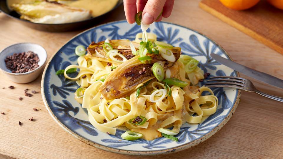 Pasta mit gebratenem Chicorée und Kakaonibs