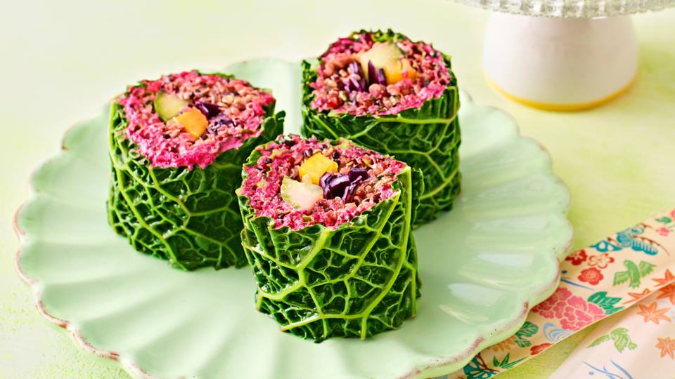 Ein Wirsingblatt auf eine Sushi-Bambusmatte legen. Etwa 1 ½ EL Brotaufstrich auf dem gesamten Blatt verstreichen. Etwas Quinoa darauf verteilen, dabei am oberen Rand ein daumenbreites Stück frei lassen. Gemüse auf dem unteren Drittel des Kohlblattes verteilen und einen Korianderstiel quer darauflegen. Das Blatt mithilfe der Bambusmatte von unten her fest aufrollen. Nach dem Aufrollen leicht andrücken und die Rolle beiseitelegen. Die weiteren Rollen nach demselben Verfahren fertigstellen.
