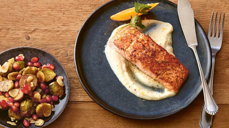 Die Lachfilets mit der Hautseite nach unten zum Topinambur-Püree reichen.
