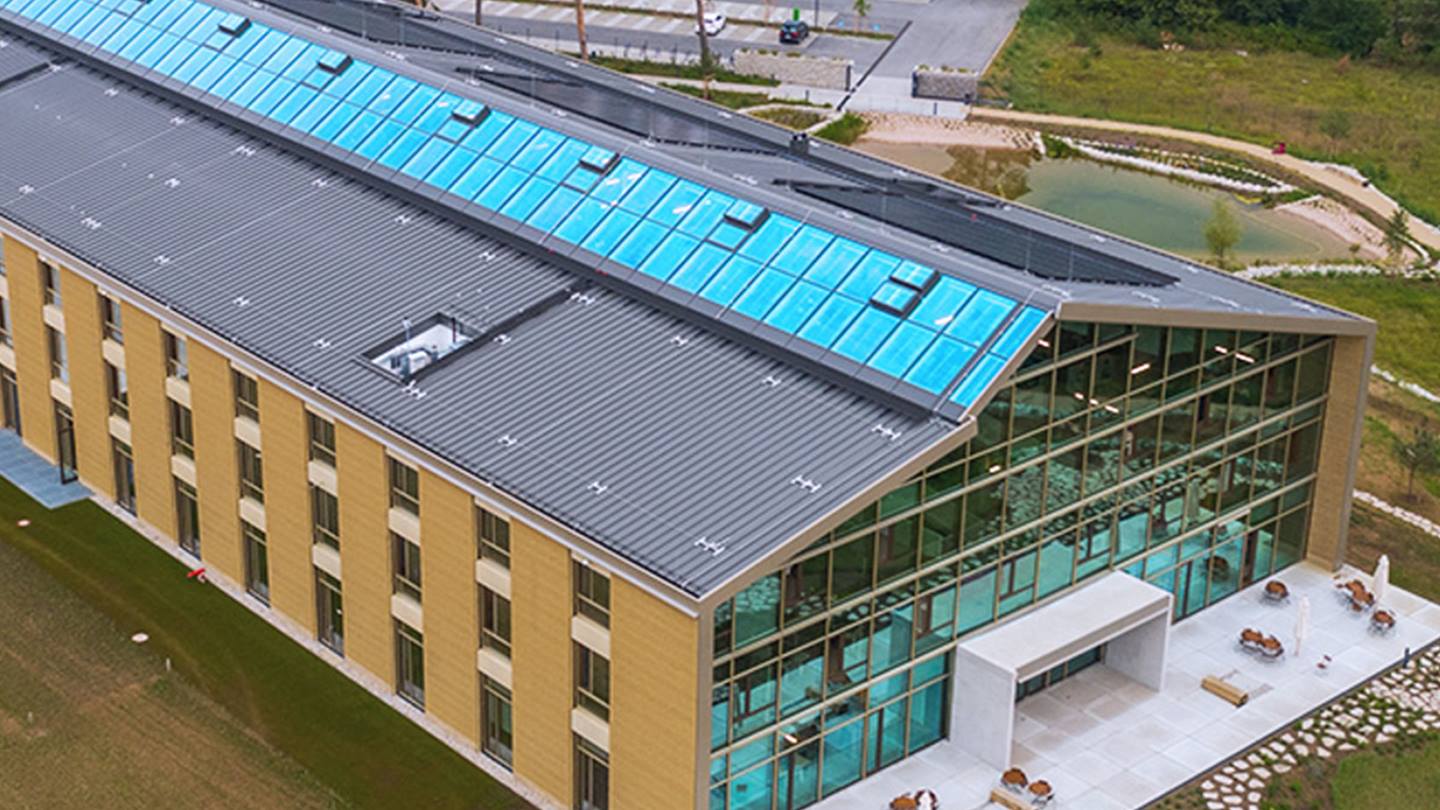 Es gibt Outdoor-Besprechungsinseln, ein „Flächenbuffet“, einen Kräutersinnesgarten, eine Lehrküche, die Weinterrasse, eine Streuobstwiese und Zisterne sowie den Teich mit begehbarer Uferkante.